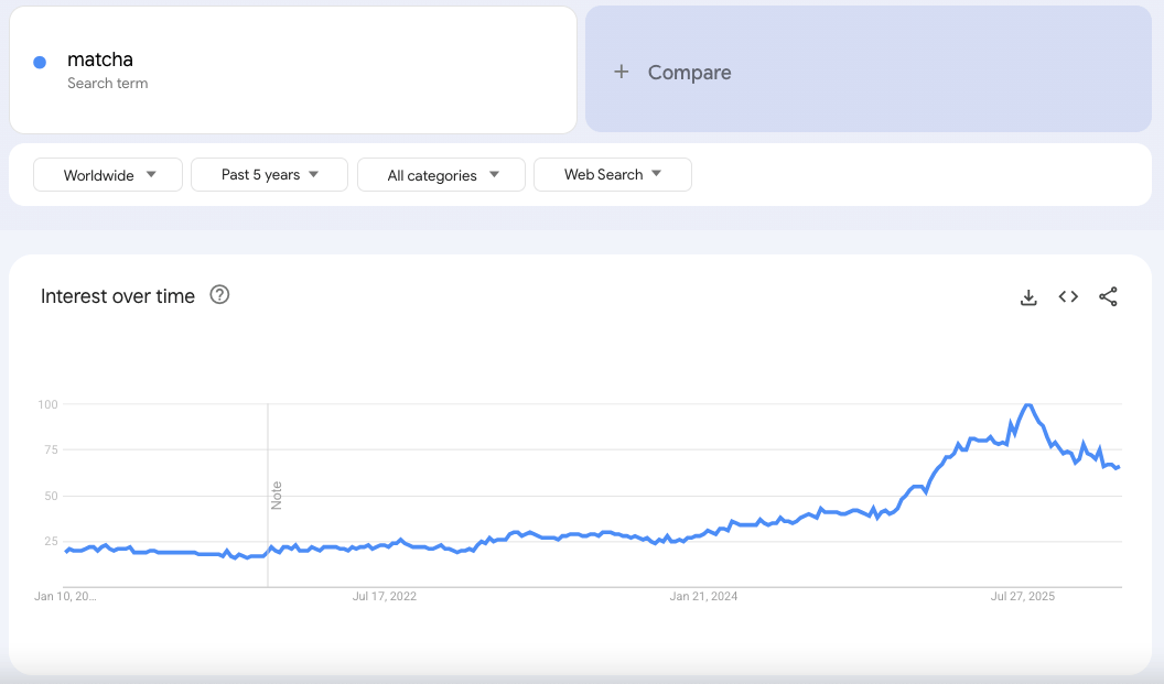 If you made it this far, then you deserve to hear my hot take. 🔥 While matcha will live on for generations as a beloved Japanese tradition, I think that American audiences are preparing to move on to their next new trend. We’re fickle consumers - and I even pulled the Google search data to support this theory.